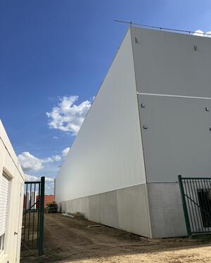 Vorige maand werden de sandwichpanelen geplaatst tegen het magazijn van ± 6000 m² dat steeds meer vorm krijgt.